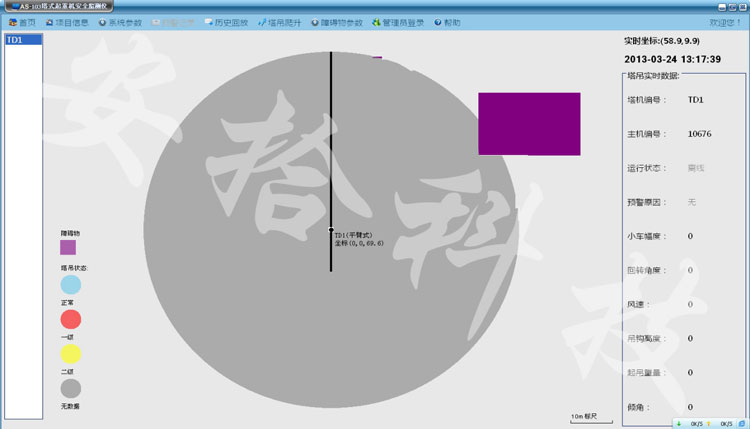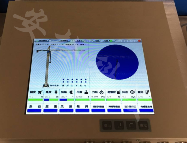 (1.1) 10.4英寸大液晶动态实时显示,分辨率800*600,能够直观的显示塔机的运行状态以及塔机的运行阈值,易于使用;塔机安全监测仪主界面显示如下参数:1)显示实际测量值:包括有小车行程、高度、回转角、起重量、力矩、风速、倾角等;2)显示塔机的基本信息:包括有塔臂长度、后塔臂长度、起重倍率、塔高;3)显示塔机的额定值:包括有风速、幅度以及相应的起重量和力矩;4)显示塔机的负荷比率、运行状态以及预警原因,提醒塔机司机进行有效判断;5)显示塔机安全制动状态,包括有塔机的上、下、前、后、左、右运动状态的控制。如图2.3塔吊防碰撞主机