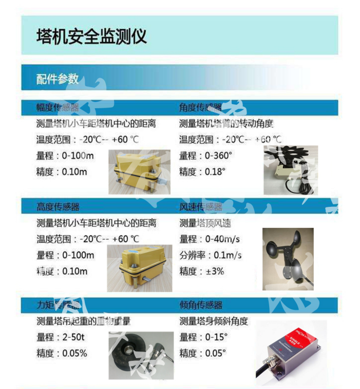< 1 > AS-101型塔机安全监测仪由带动态显示的主机(内置制动控制)、角度传感器、幅度传感器、风速传感器、力矩传感器、重量传感器、倾角传感器、高度传感器、无线通信模块等组成。如图1.9塔吊安全监测仪。