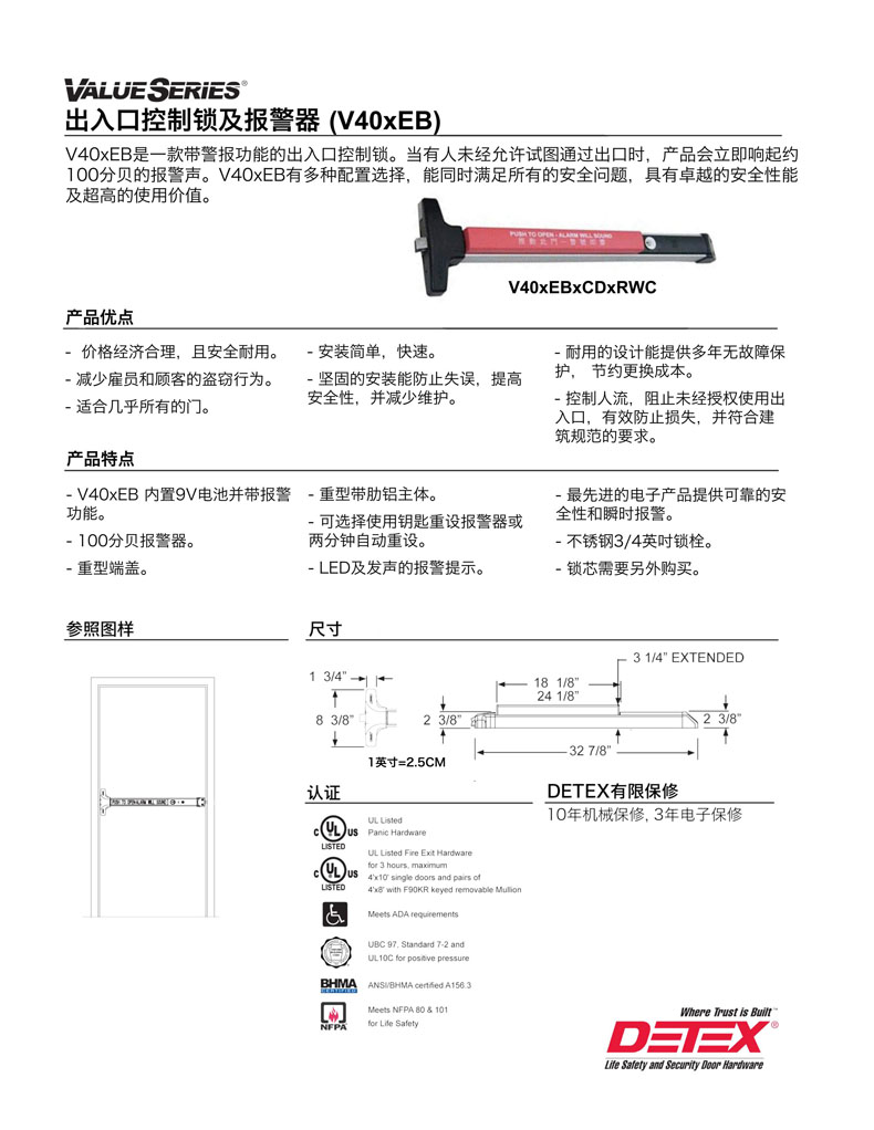 美国原装DETEX 通道推杆锁V40xEB