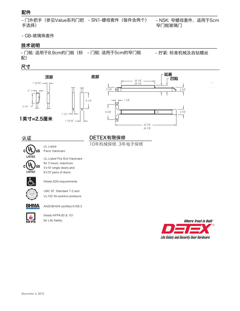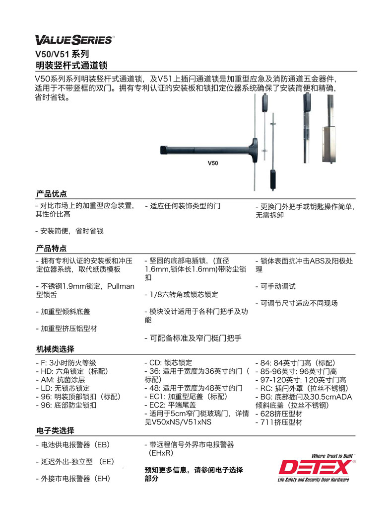 美国DETEX 超值系列V50天地插闩通道推杆锁