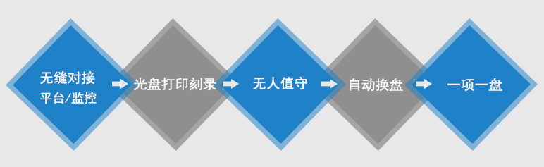 支持高清蓝光视频数据刻录,支持后期快速检索查询并快速调阅光盘,全自动智能盘面打印;