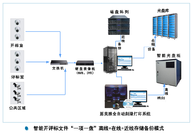 开评标音视频数据光盘刻录归档系统,又称智能化开评标音视频数据同步归档备份保存系统,严格遵守“第87号文件”和“采购法 ”有关规定,由我司高新科技企业——派美雅按需定制开发首家推行,解放人工手动查询导出视频到本地,手动选取光盘刻录模式,自动获取项目名称,按照用户需求智能刻录到一张或多张光盘上并盘面打印,并全面支持CD/DVD/BD数据光盘,归档保存15年以上。