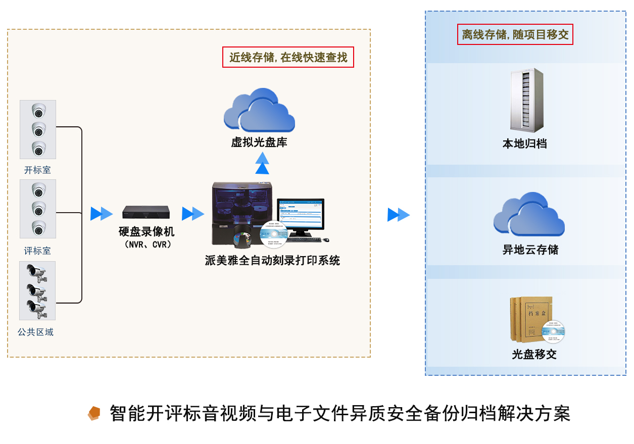 为满足安防视频监控的规范性要求,解决司法行业(如公安、法院、纪委监察委)、公共资源交易中心、银行金融、油田、教育等各领域海量视频存储、检索难、手动下载刻盘换盘等瓶颈问题,以智能化、自动化、安全化视频文件存储管理为核心,融合集中存储、回放补刻、全自动打印刻录归档等一系列功能,按需推出派美雅监控视频光盘刻录异质备份系统。
