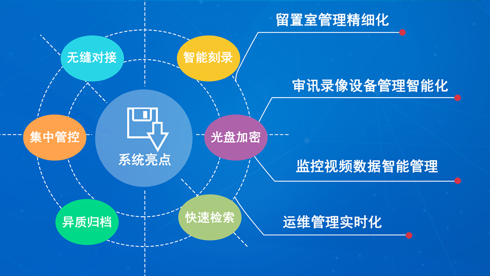 支持无缝对接主流或非主流的视频监控管理平台,NVR,DVR,审讯主机,审讯系统,庭审系统,谈话系统等设备级联、控制等,实现同步录音录像数据光盘全自动实时刻录或集中自动按需光盘刻录打印全自动一体化。