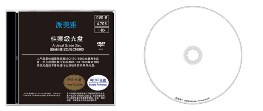派美雅国际档案级光盘分为普通胶印盘面,喷墨可打印及热转印盘面档案级光盘,用户可根据自己的需求进行选择。