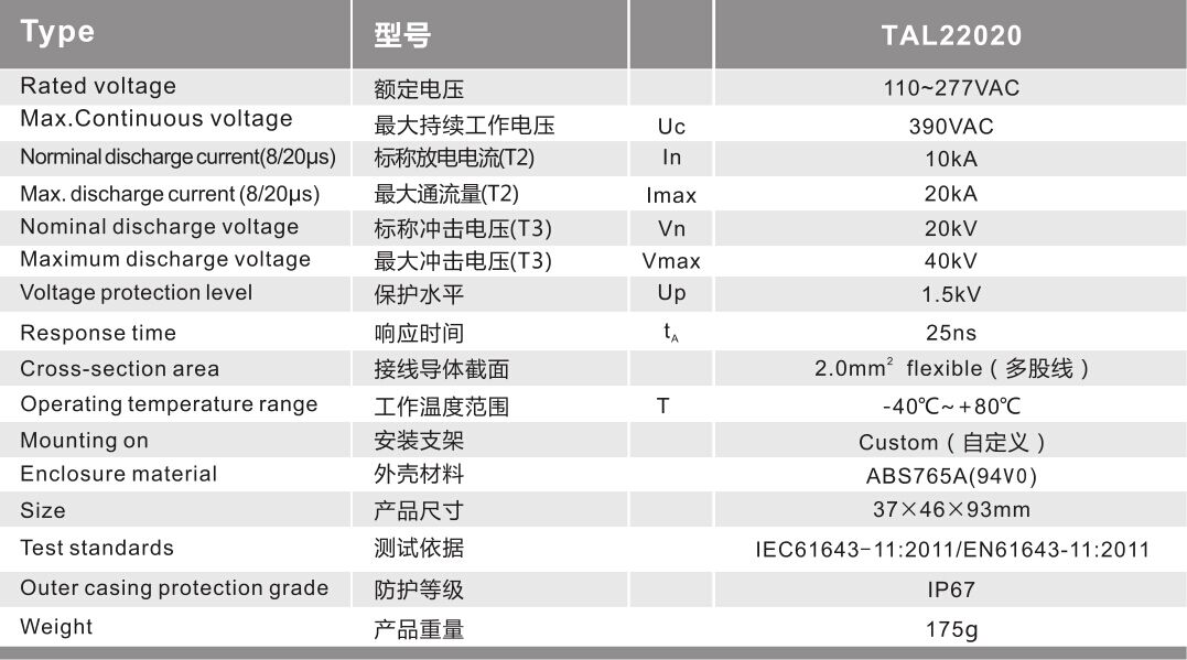 LED路灯电源防雷器 TAL22020 过UL认证CE认证 通流量20KA 耐压40KV