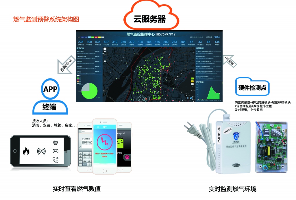 智能GSM独立语音型燃气泄漏探测器分为探测器端、云服务器端、用户手机APP或PC端三个部分组成,下面就为您分别介绍各个部分是怎样工作的以及各部分之间是如何通讯链接的。