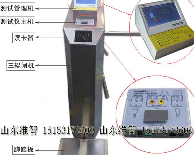 在进入净化车间前配置通道闸(三辊闸或摆闸、翼闸),通道闸上面可集成人体综合静电测试仪集和门禁管理系统,并诊对不同的人员设置不同权限的测试(ESD静电门禁系统也可统一设定所有人员的权限)并可记录员人的刷卡和静电测试记录等信息。如:
