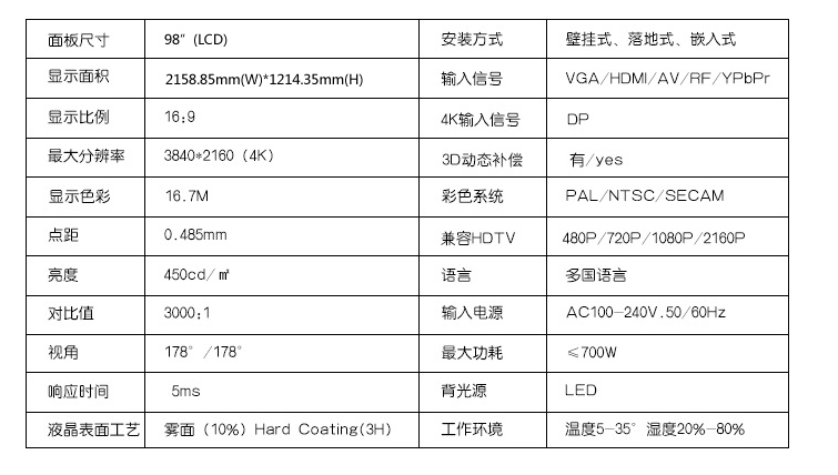 98寸高清4K商用液晶监视器,拥有LED屏幕及3840*2160超高清分辨率,4K分辨率作为大尺寸显示屏的一大亮点,震惊你视野的超大屏幕画面质量,使你能够清晰的将屏幕内容一览无余,是小尺寸屏幕拼接方式无法媲美的。拥有4K高清技术,轻松一键4K高清,当近观影像时,甚至看不到画面边缘,具有极强的投入感。自动温控、低功耗、防尘、防潮、抗震等卓越的性能设计有效的延长了高清液晶监视器的使用寿命,同是能够满足7X24小时的工作需要。