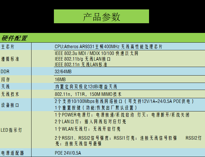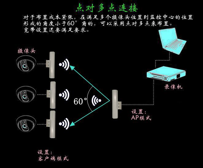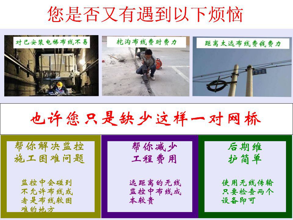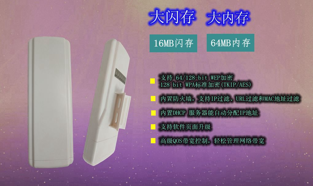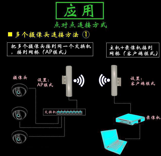 无障碍点对点1km传输,2.4G无线频率,150Mbps传输速率,使用12dbi的双极化高增益天线,定向天线信号更集中、传输得更远、更稳定,两台设备组成一对网桥点对点无障碍可传输1公里。