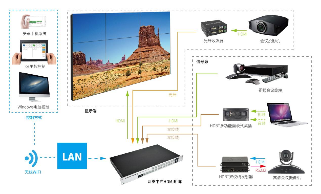网络中控HDMI矩阵13V14是一款新一代支持手机(安卓、ios系统手机)控制、iPad控制、WEB双向控制及APP集中管理的HDMI矩阵产品,操作更加灵活方便,且支持HDMI1.4a标准和EDID管理,适应现场多样化的显示设备,提高兼容性,分辨率可达4K@30HZ、1080@120HZ的HDMI矩阵。支持音视频同步切换,适用于会议室、指挥中心、多媒体室等应用场景。