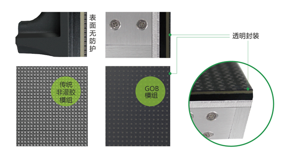 作为GOB工艺技术的开创者与先行者,浩翔GOB透明屏填补了行业内透明屏不能用于户外的空缺;浩翔GOB小间距与COB小间距相比,解决了COB小间距维修成本高、模块化严重、无法分光分色、一致性差、表面平整度差、制作成本高等问题。