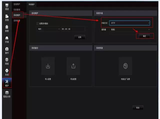 右键-主菜单-维护-系统维护-升级方式选HTTP-确定