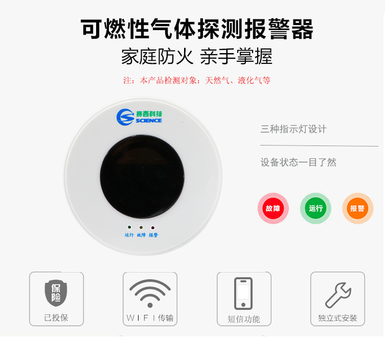 SC-JB2家用智能可燃气体报警器是在常规版的基础上进行功能升级,集成WiFi网络模块,组成功能强大的联网功能,当可燃气体浓度达到报警器设置的报警值时,除发出自身报警提示声,并通过WIFI发送信号至网络用户端,通过网络用户端发出手机短信报警提示,及时提醒用户作出防止燃气泄漏的措施。