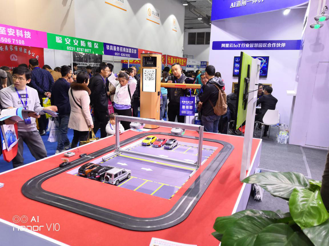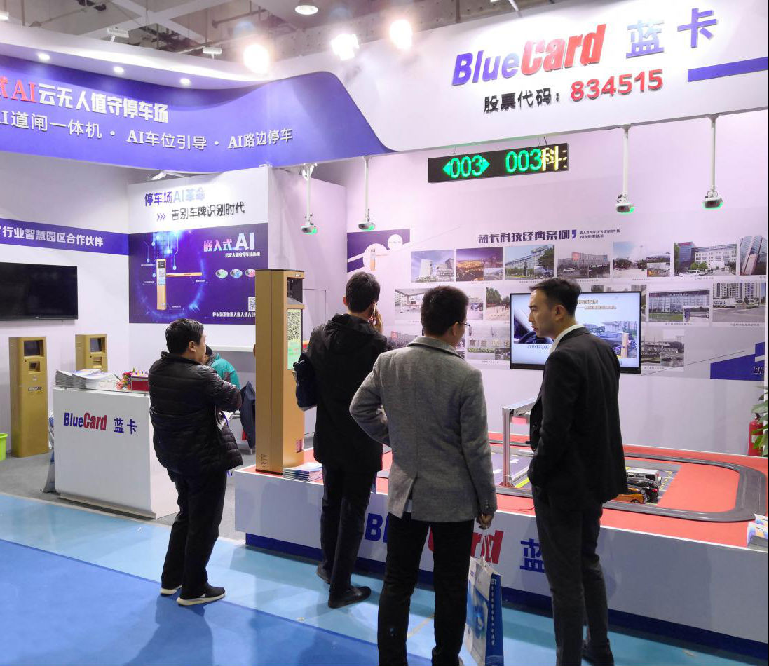 蓝卡科技展台主要为AI云无人值守停车场+AI车位引导动态演示主展区、AI道闸一体机动态演示区。