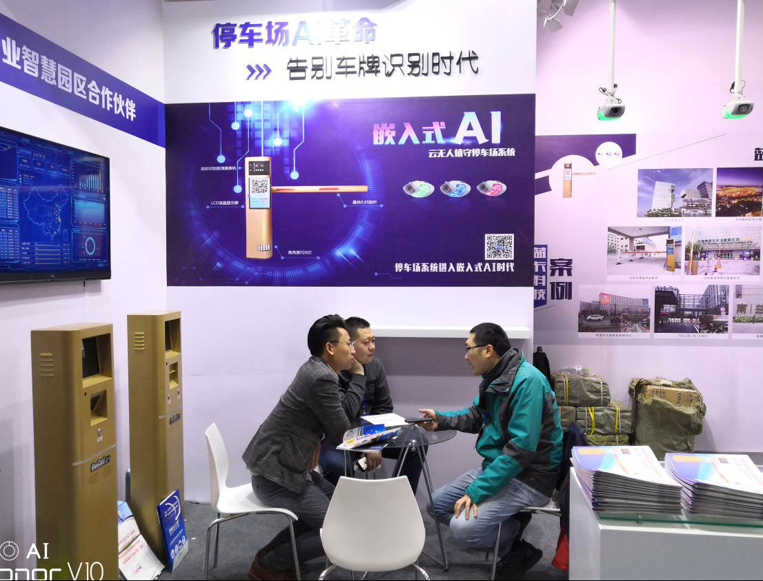 观众对“AI云无人值守”停车场有浓厚的兴趣,主动坐下来与销售人员现场交流,大家围绕着动态演示、一体机敏捷的抬杆速度、金色高档的外观、超亮的LCD屏深入谈论着加深了解。