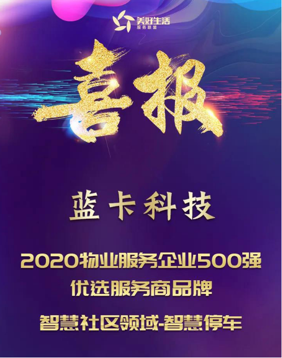 此次会议上,备受关注的《2020美好生活服务联盟500强物业服务企业优选服务商测评报告》正式发布,基础服务、增值服务、智慧社区三大领域的“2020物业服务企业500强优选服务商品牌”榜单同期揭晓。蓝卡科技凭借多年自主知识产权研究、技术创新及停车场行业深耕,通过网络投票、专家测评、物业公司推荐等多环节考评,最终荣获“2020物业服务企业500强优选服务商品牌智慧社区领域-智慧停车”奖项。