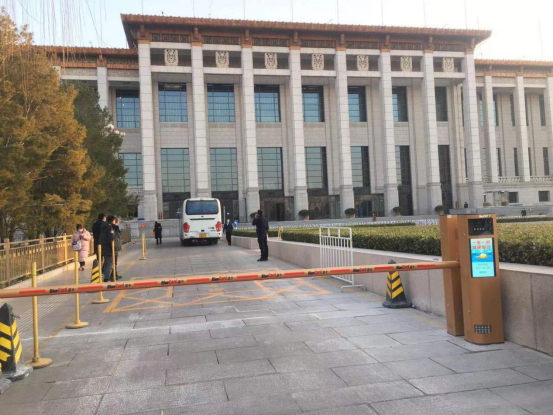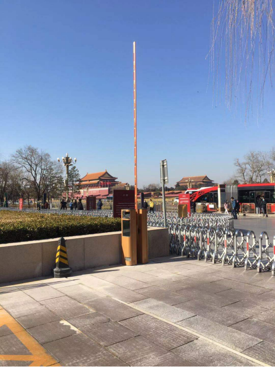 由于国博的特殊位置,从停车场可遥望天安门城楼及观礼台。阳光下,金色一体机一起一落守护着车辆通行,像一位挺拔的卫兵,显得格外耀眼。