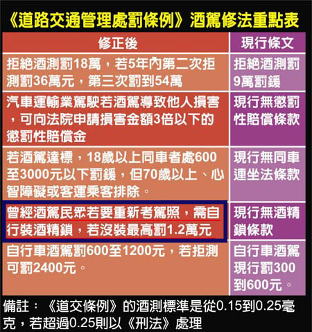 3月26日,立法院会通过《道路交通管理处罚条例》修正案,主要包括汽车、机动车行政处理,提高罚金,同车连座责任,车辆以及延长吊扣照时间,除了加重酒驾处罚外,为了从源头杜绝酒驾,要求累犯酒驾者必须驾驶有酒精锁的车辆才能上路。