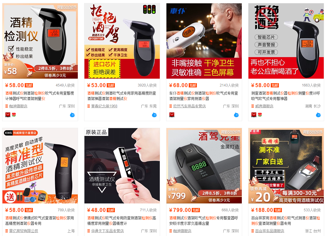 有很多驾驶员为了防止酒驾被查,抱着侥幸心理,在网上购买酒精检测仪,喝酒后先测试下,不超标才“安心”上路,在淘宝上随意搜索“酒精检测仪”出现上千种产品,价格从几十元到上千元不等,而且销量惊人。