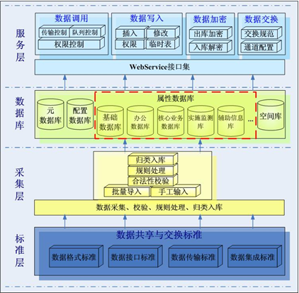 数据管理平台采用四层设计,主要有标准层、采集层、数据库层、服务层。在标准层采用国际标准及国家标准对输入数据标准化,采用标准编码,使进入数据库的数据格式共享,实现了数据格式标准、数据接口标准、数据传输标准、数据集成标准,通过这些标准的制定,系统就能够实现各个层面的良好交流。
