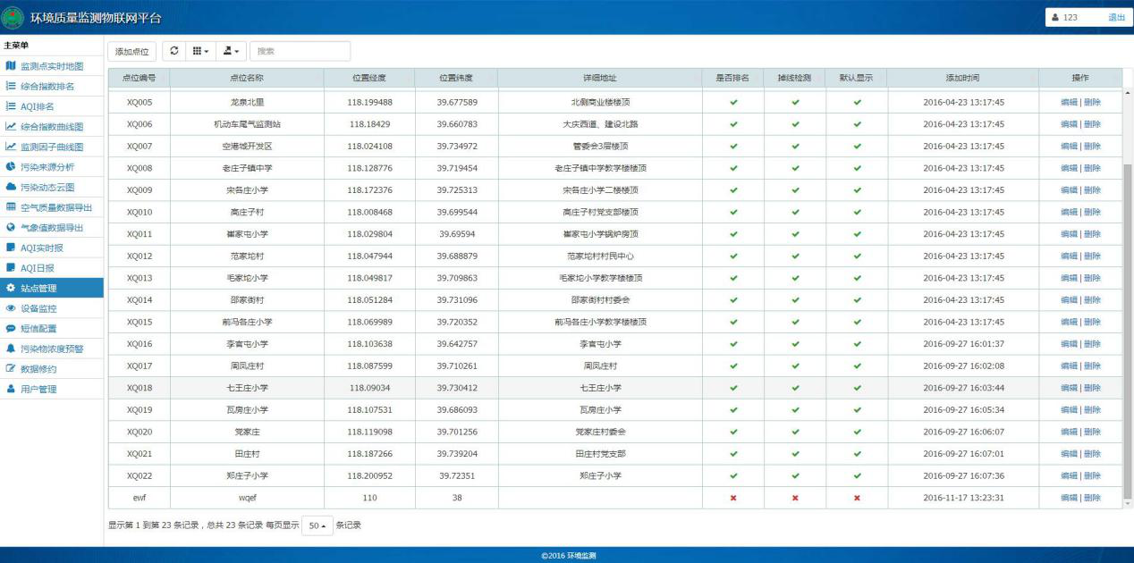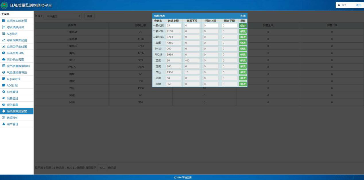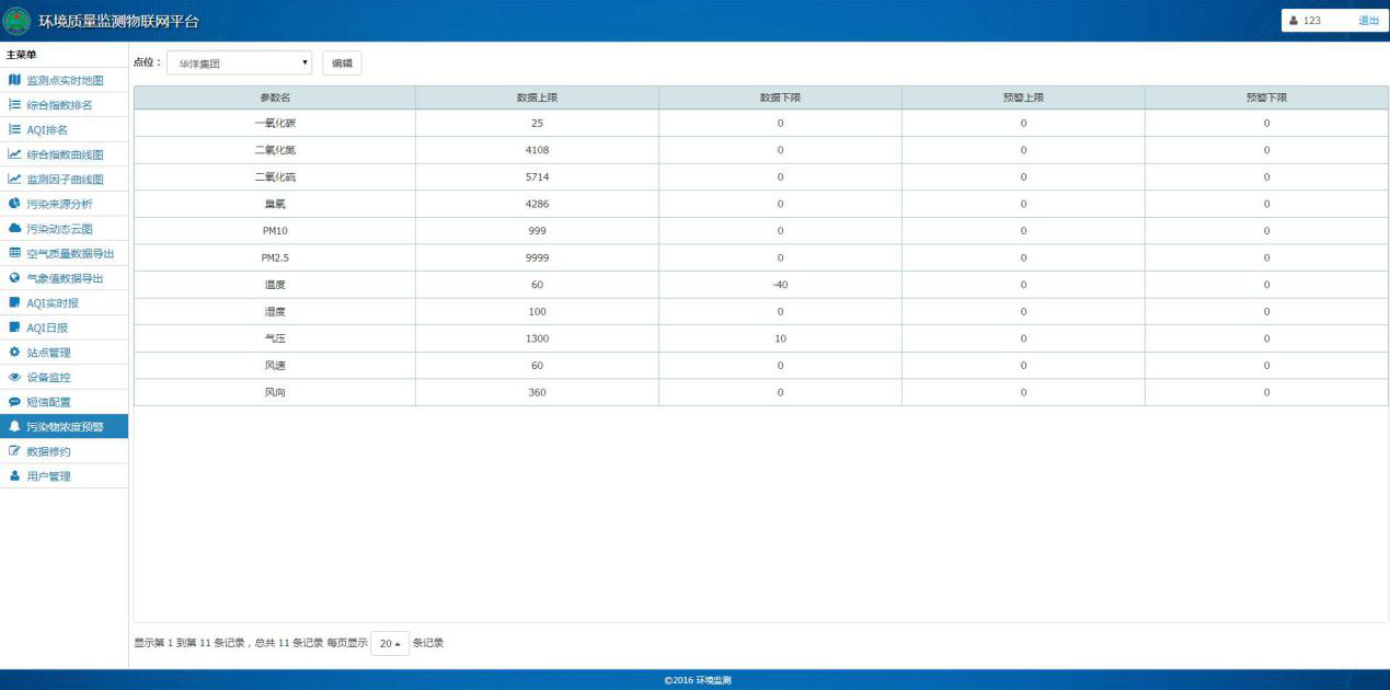 站点参数管理:用于维护站点所监测的指标,并对检测指标设定报警上下限信息等。如果达到设置报警参数时,可以通过短信、邮件推送进行预警通知。