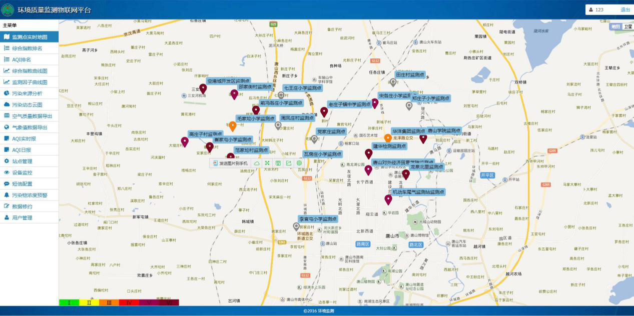 在应用层,可以GIS方式直观、形象的实时显示各监测点位和整个区域的空气质量状况,以及污染物浓度水平,并提供异常报警、区域空气质量变化趋势等多种服务。