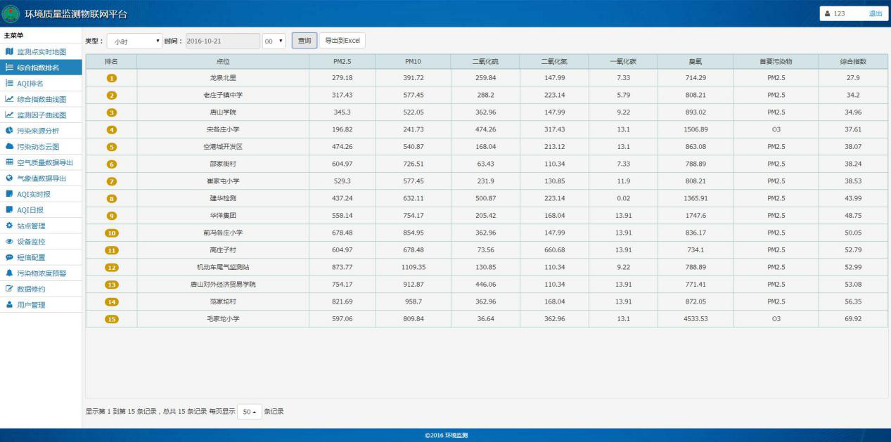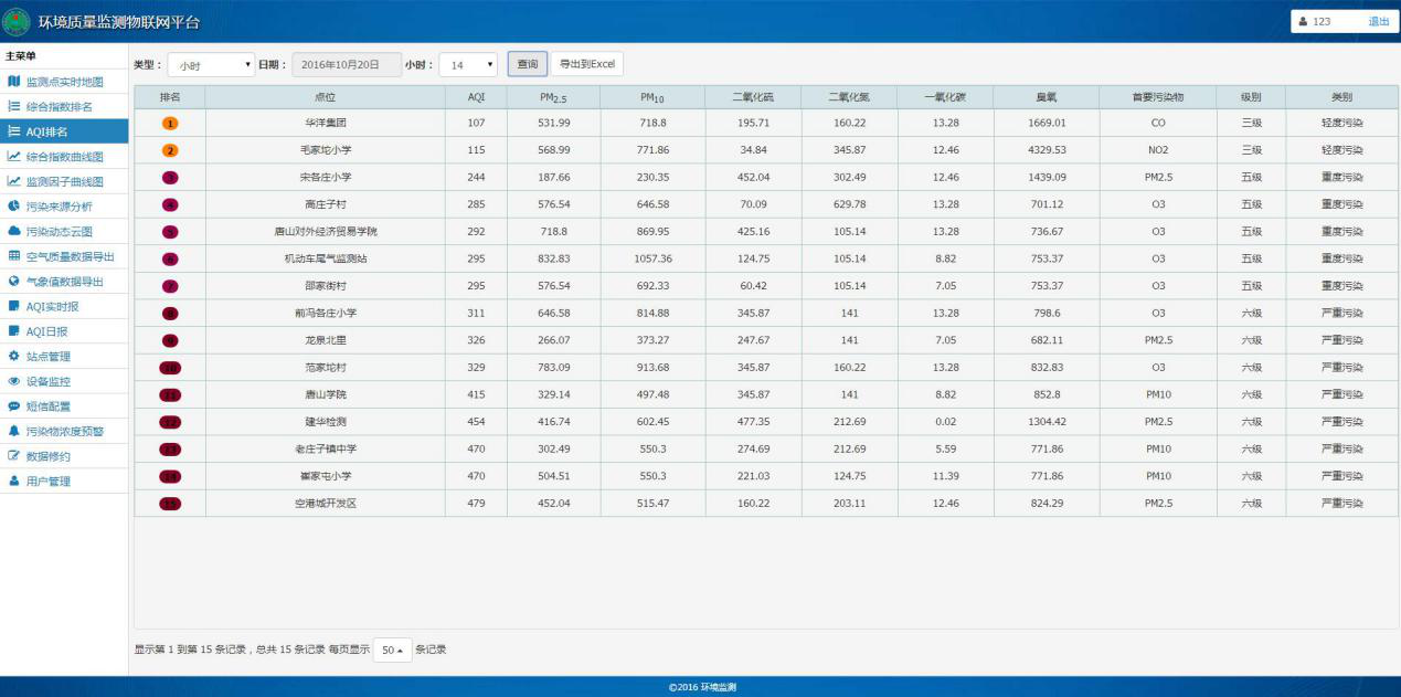 AQI日,周,月数据统计排名:以日,周,月为统计周期以列表方式对各个站点的平均检测值进行统计,并根据污染情况不同以颜色进行渲染,更直观显示当前AQI排名情况,查询条件更加灵活,并可以设置自动排序功能。