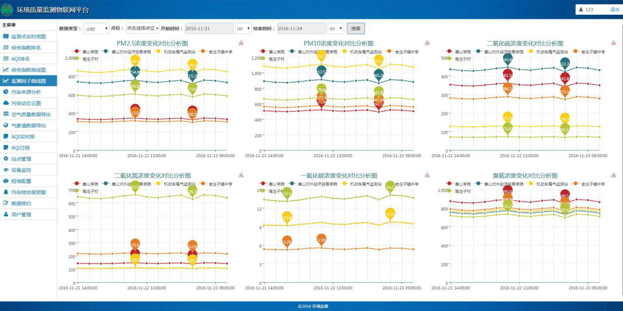计对比:根据大数据统计站点的数据趋势,然后根据各个站点的同期数据进行对比分析,得出污染物形成扩散的相关情况,查询条件包括污染物类型(PM10,PM2.5,SO2,NO2,CO,O3,VOC),数据类型(小时,天,周,月,年),可以以图表方式体现。