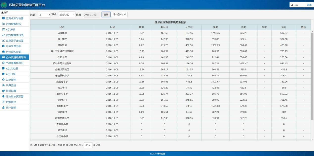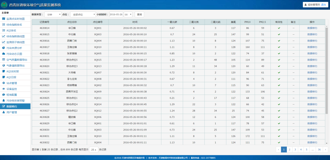 监测点位详细数据查询:依据数据有效性规定、AQI评价技术规范、数据倒挂修约规定等进行数据审核、审核处理,做出各子站的空气质量数据,包括PM2.5,PM10,SO2,NO2,CO,O3,温度,气压等指标,以推动环境空气质量工作的进展。