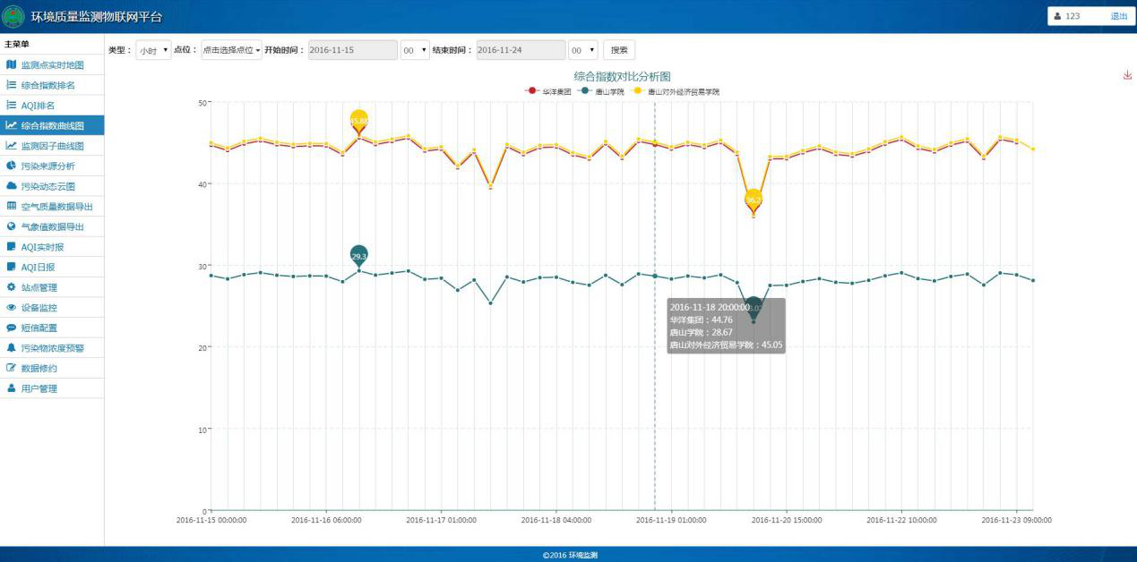 监测点位日,周,月同期分析:可以实时对比某一个时间点某个监测点的监测值与其他监测点相同时间点的同比及环比数据分析,也可以显示同一监测点位1到24小时的均值情况。