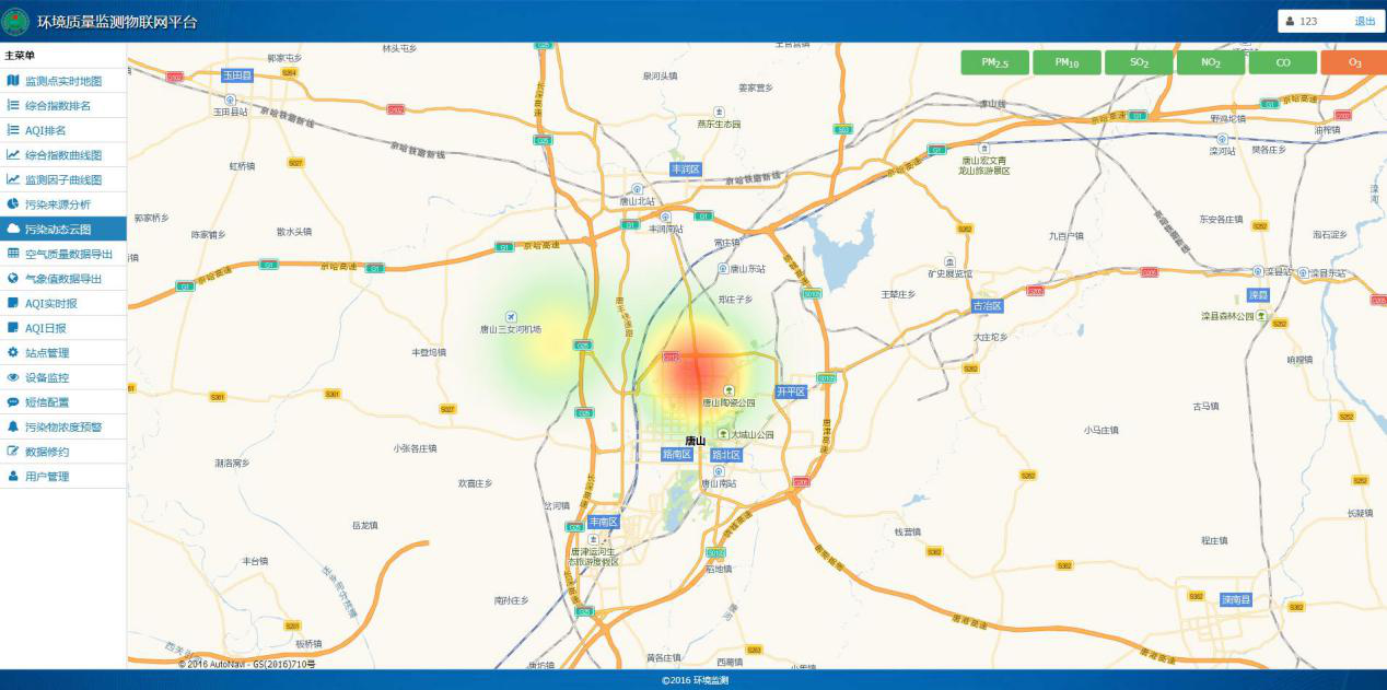污染物动态云图:由于区域间空气质量状况的差别,系统基于各个区域内监测数值实时以污染物浓度云图形式渲染这种差别,云图取每小时点位数值,颜色采用空气质量指数AQI表示颜色,实现由“点”到“面”全面展示大范围内空气质量状况。