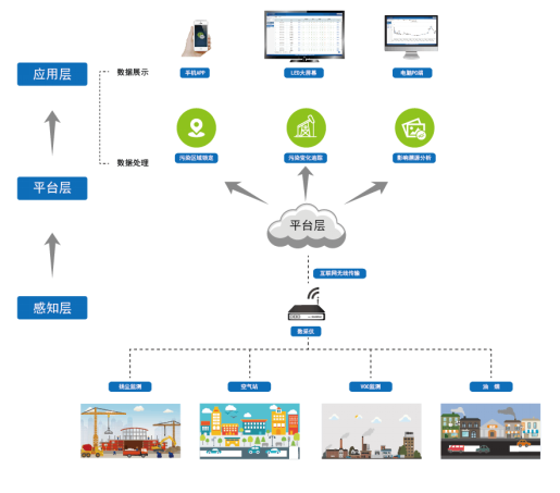 其中,感知层由大密度布设微型空气监测站、TVOC监测仪、扬尘监测仪监测站等前端监测设备组成,并通往无线网络把各个监测设备的监测数据传送到中心平台。