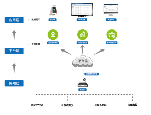 其中,感知层由气象站、微型空气监测站、水质监测仪、土壤监测站、视频监控等前端监测设备组成,并通过无线网络把各个监测设备的监测数据传送到中心平台。