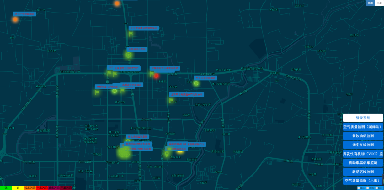 在应用层,可以GIS方式直观、形象的实时显示各监测点位和整个区域的空气质量状况,以及污染物浓度水平,并提供异常报警、区域空气质量变化趋势等多种服务。