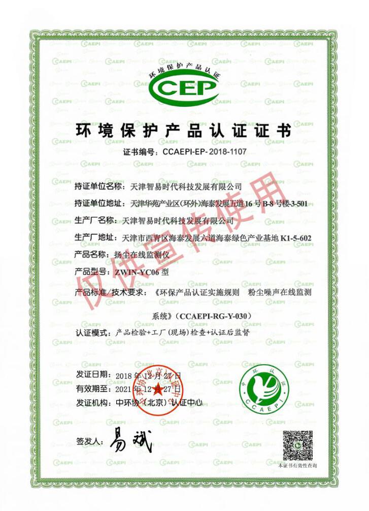 潜心钻研,创新发展,以人为本,质量为先。天津智易时代科技发展有限公司再次凭借过硬的综合实力斩获一员大将——中国环境保护产品认证证书(扬尘在线监测仪),证书编号:CCAEPI-EP-2018-1107。