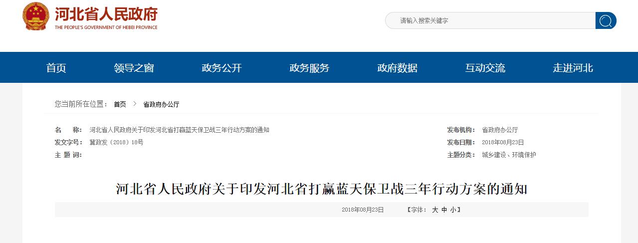 2018年8月23日河北省人民政府出台并印发《河北省打赢蓝天保卫战三年行动方案》,持续深入开展大气污染防治攻坚行动,以实现全省空气质量“保底线、退后十”的目标任务。
