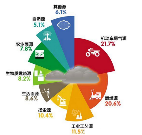 随着城市不断发展,机动车尾气已成为空气污染中具备数量多、增长快、流动强、分散广等特性的污染源,根据环保部门PM2.5来源解析工作研究结果表明,目前PM2.5的主要来源是机动车、燃煤、工业生产和扬尘,其中:机动车占比第一的代表城市有北京、深圳、杭州、广州等;燃煤占比第一的代表城市有石家庄、南京等;扬尘、流动源、工业生产占比第一代表城市:天津、上海、宁波等。空气污染源统计分布如下图: