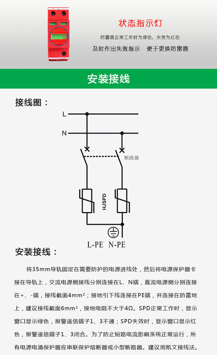 将35mm轨道固定在需要防护的电源进线处,然后将防护单元卡接在35mm轨道上,电源侧接线分别连接在L、N端,接线截面6mm2;接地引下线接在PE端,并连接在防雷地上,所用引线截面10mm2,接地电阻不大于4Ω。SPD正常工作时,显示窗口显示绿色,SPD失效时,显示窗口显示红色。