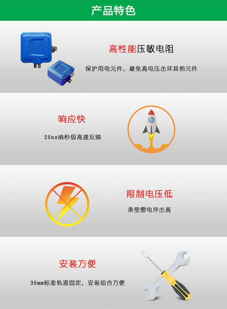 HJSPD40/2-385型电源电涌保护器,主要针对单相电源系统交流电网中尖峰干扰、感应雷过电压及操作过电压的防护。采用具有劣化自动脱离和指示的过电压保护器组合而成,对感应雷过电压具有良好的防护效果。外形结构紧凑整洁,接线方便。防护模块对过电压响应速度快,吸能本领大,限制电压低,安装组合方便,无需停电可更换任一模块。模块在失效时能自动脱离使用线路,同时显示窗口变为红色给出明显指示,并可提供遥信端子开关量输出,可以及时发现并更换该防雷单元,可广泛用于铁路信号、邮电通信、机场、油田、计算机、高层建筑等低压配电电源的瞬时过电压(浪涌吸收)防护。