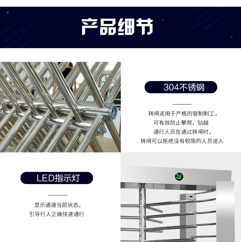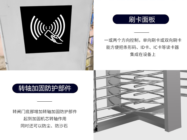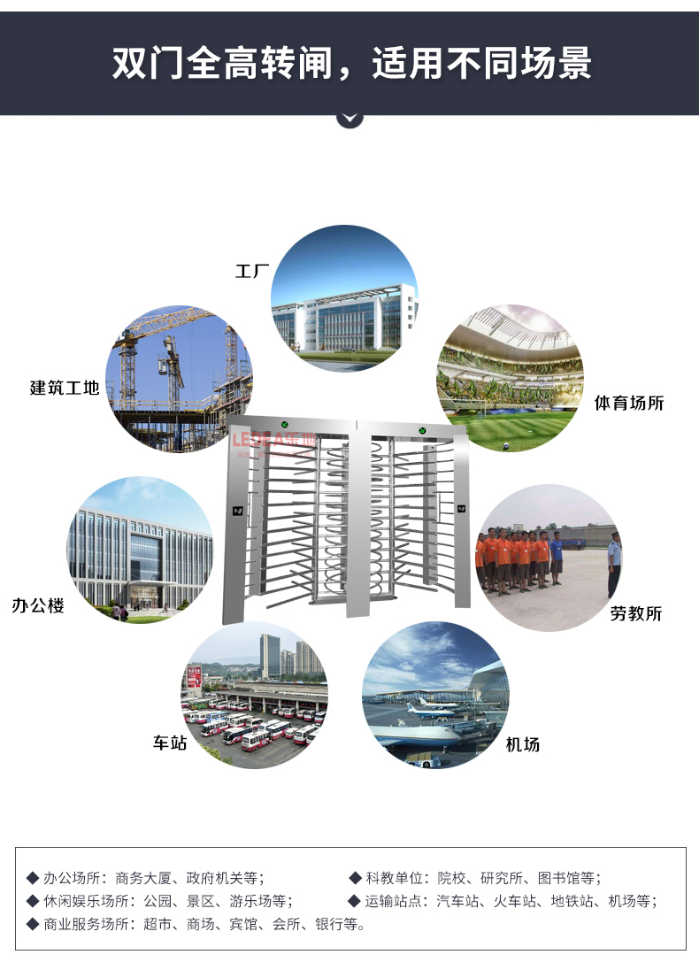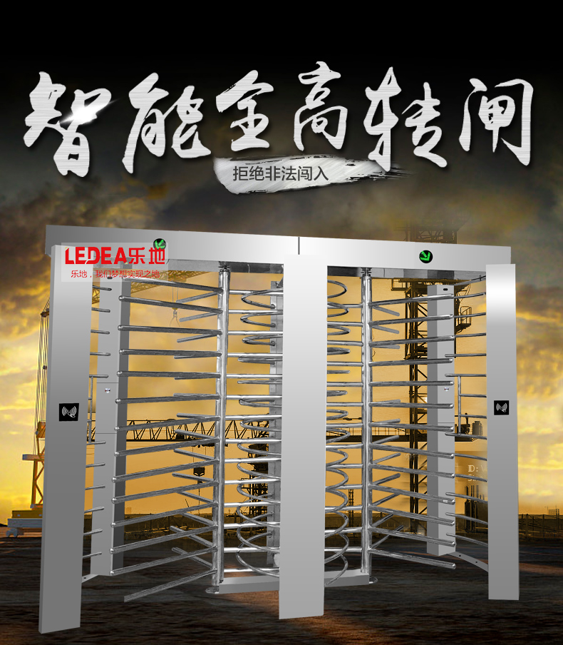 全高转闸: 转闸分为90度和120度两种,主要用于通道出入口管理,具有安全、方便、杜绝非法出入,并在紧急情况下快速控制自由通行等特点。广泛应用于机场、车站、码头、景点、公园、智能小区、监狱等需要对通道实现智能化管理的场合。