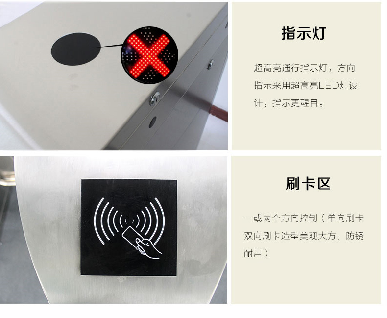 (3)防非法闯入功能:刷卡无效、没有刷卡或禁止通行时,强行推摆将被视为非法闯入,系统会自动报警并将闸摆上锁。