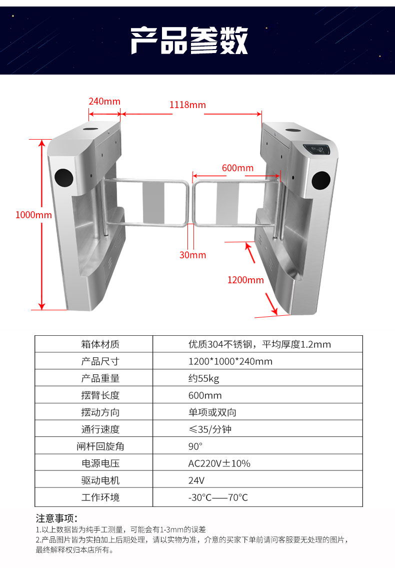 (9)防冲撞功能:闸摆在上锁状态下,可承受安全范围内的冲撞力,超出安全范围时,闸摆可以缓慢推动,以保护机芯和行人,之后自动复位。