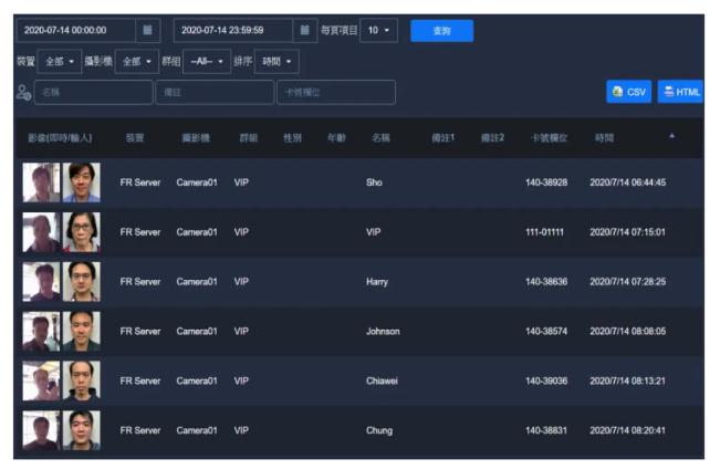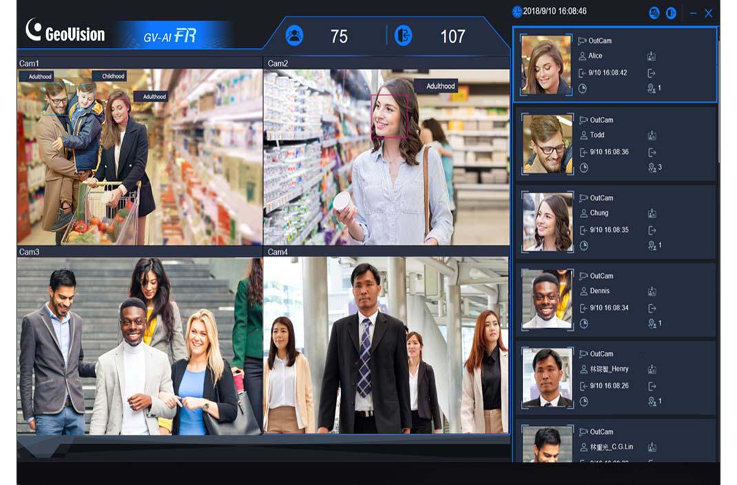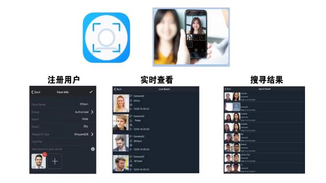 AI-FR配备移动端应用程序GV-Face,APP直接连接FR服务器主机,打开APP可以直接对来访用户进行快速人脸信息注册登记,登记信息录入主系统数据库后使用APP亦可随意调看,同时也可以查看人员实时的出入信息和通行情况。