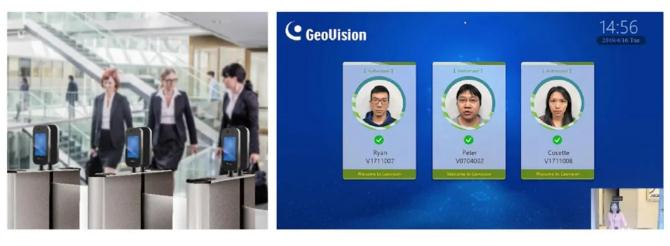 配合无感式门禁开门的应用功能当来宾被识别允许通行之时,系统同时间通过事先安装的迎宾显示设备输出相对应的互动迎客信息欢迎此来宾的光临。