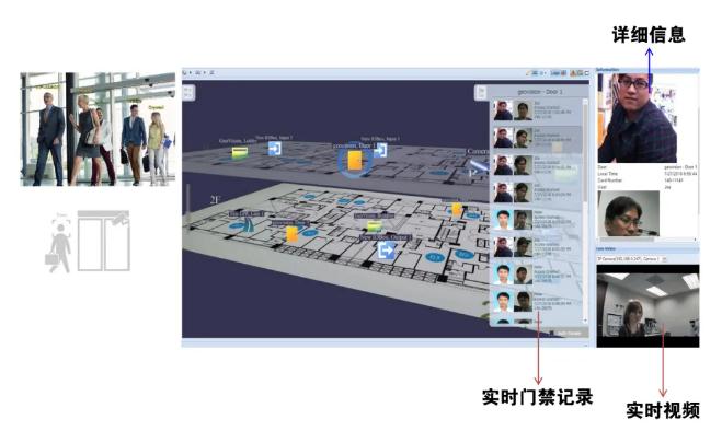 AI-FR联动GV-VMS和ASManager允许创建3D电子地图,用户先行在地图中设置对应的门禁与视频点位后,当发生人脸识别事件时系统将直观的标示出事件发生的地点位置与对应人员信息,同时亦可事后调阅录像数据,实现人员运动轨迹快速查询。