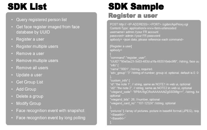 AI-FR平台开放并提供丰富Sdk和API接口,支持第三方客户进行数据库提取深度挖掘应用潜力进行特色功能开发和增值服务,同时也支持与第三方门禁系统进行数据同步开发对接。