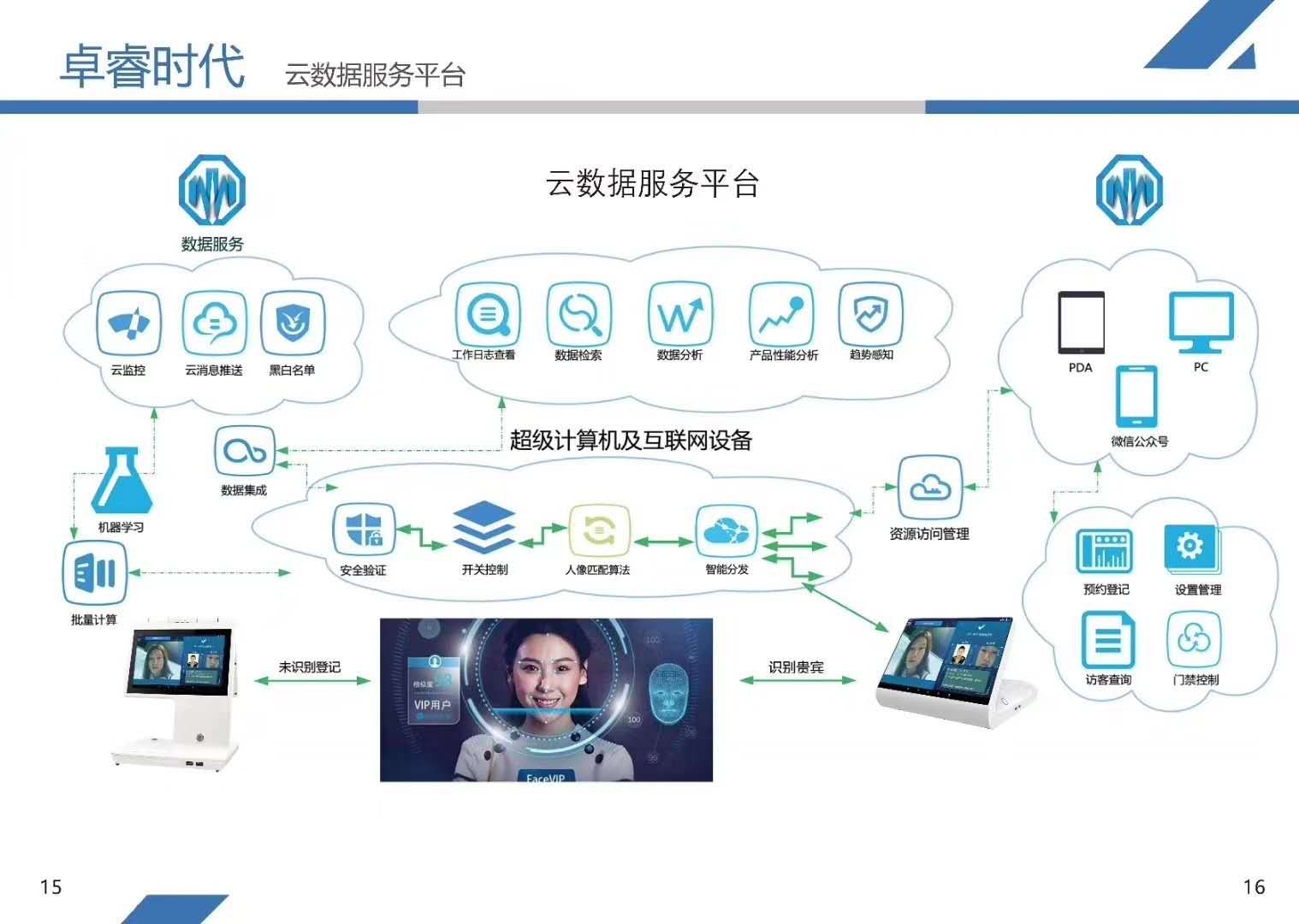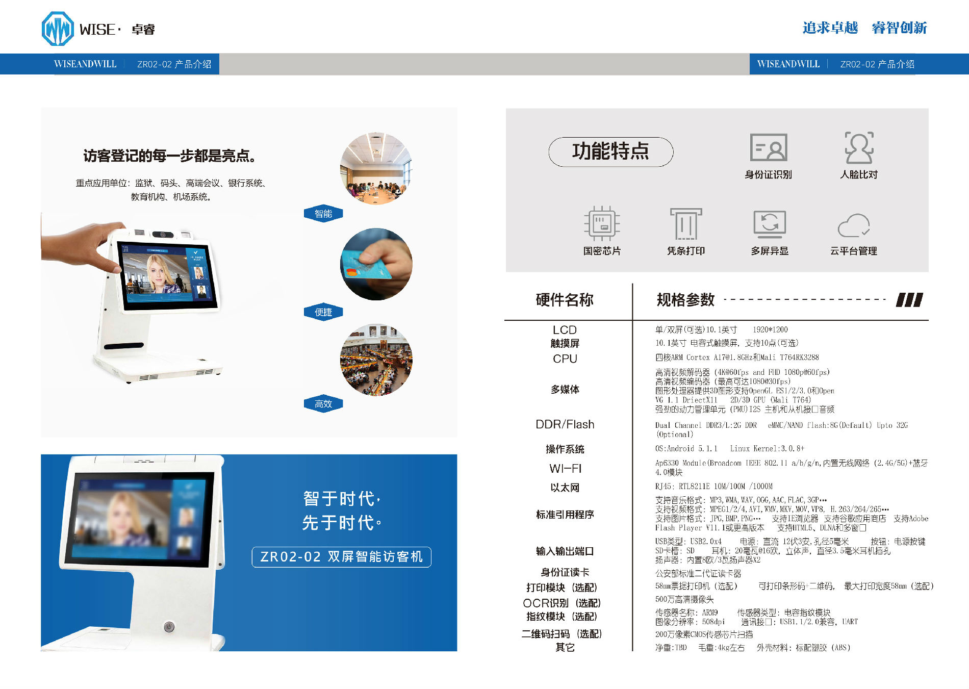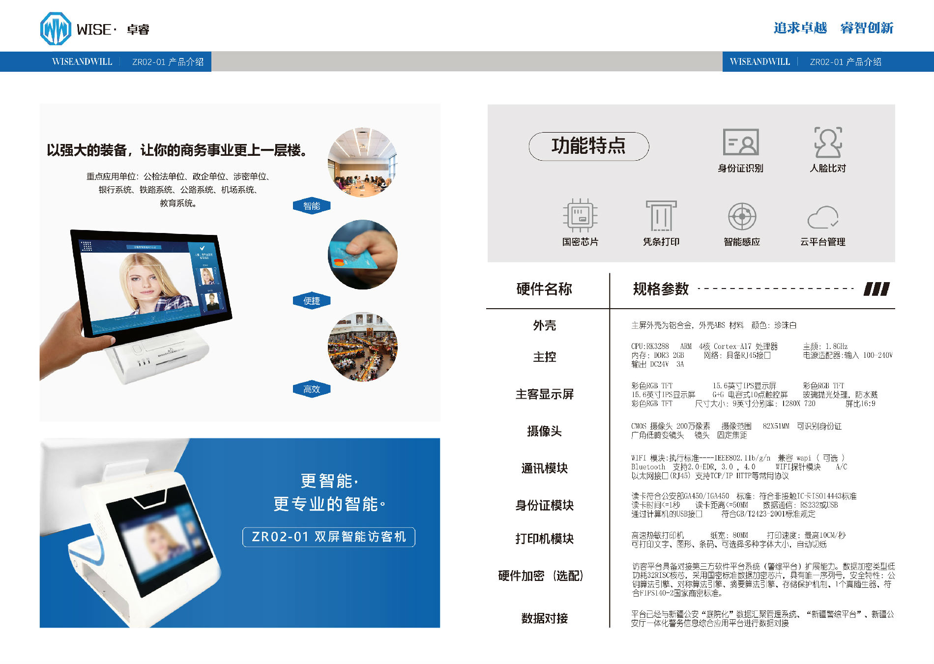 卓睿时代(天津)科技有限公司 卓睿 政府访客一体机 ZR02 高清人脸识别 人证合一比对系统 人证核验系统 自助访客管理系统 单/双屏(可选)10.1英寸 电容式触摸屏 沿用流线外形设计 大气高端 超高配置 性能强悍的访客一体机 能轻松对接各类系统(可轻松做各类门禁,道闸和人证比对系统控制中心,对接各类系统)拥有高亮LED补光灯,人脸比对,身份证识别,热敏打印,指纹模块,高清摄像头,智能感应,云平台管理,高精度扫描模块(可识别二代证)。可实现:访客信息登记,被访人信息登记,现场拍照及人证比对等(如:访客登记和签离,访客数据管理,联动道闸门禁,智能访客预约等)。售前服务:通过全面周到的售前服务帮助客户选择适合产品或解决方案。上门安装:专业的技术工程师为客户提供上门安装服务。人员培训:应客户要求及实际需要派出技术人员对客户进行技术支持和使用培训。售后服务:提供完善的使用手册,维护文件等文字及相关资料,全国联保,提供维修服务。平台已经与新疆公安“庭院化”数据汇聚管理系统,“新疆警综平台”新疆公安厅一体化警务信息综合应用平台进行数据对接.