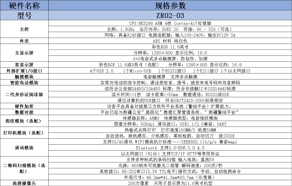 卓睿时代(天津)科技有限公司 卓睿 政府访客一体机 ZR02 高清人脸识别 人证合一比对系统 人证核验系统 自助访客管理系统 单/双屏(可选)10.1英寸 电容式触摸屏 沿用流线外形设计 大气高端 超高配置 性能强悍的访客一体机 能轻松对接各类系统(可轻松做各类门禁,道闸和人证比对系统控制中心,对接各类系统)拥有高亮LED补光灯,人脸比对,身份证识别,热敏打印,指纹模块,高清摄像头,智能感应,云平台管理,高精度扫描模块(可识别二代证)。可实现:访客信息登记,被访人信息登记,现场拍照及人证比对等(如:访客登记和签离,访客数据管理,联动道闸门禁,智能访客预约等)。售前服务:通过全面周到的售前服务帮助客户选择适合产品或解决方案。上门安装:专业的技术工程师为客户提供上门安装服务。人员培训:应客户要求及实际需要派出技术人员对客户进行技术支持和使用培训。售后服务:提供完善的使用手册,维护文件等文字及相关资料,全国联保,提供维修服务。平台已经与新疆公安“庭院化”数据汇聚管理系统,“新疆警综平台”新疆公安厅一体化警务信息综合应用平台进行数据对接.