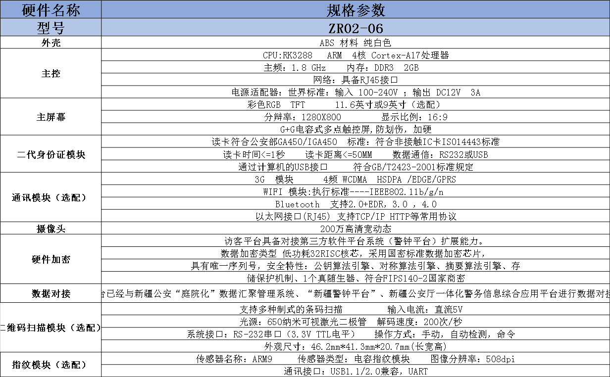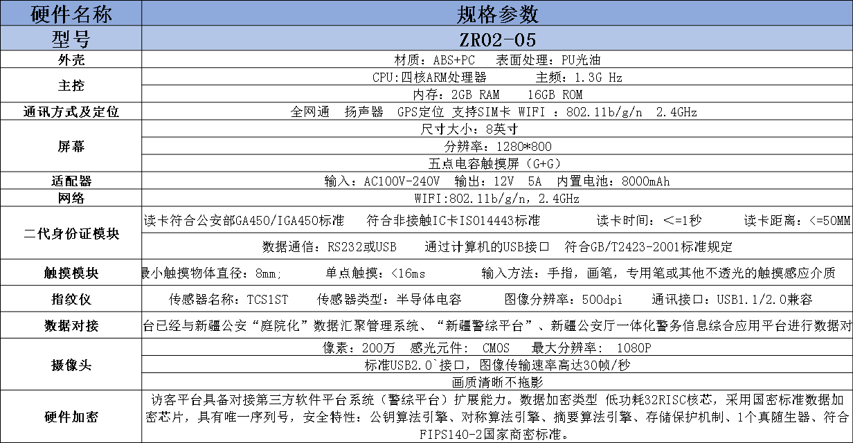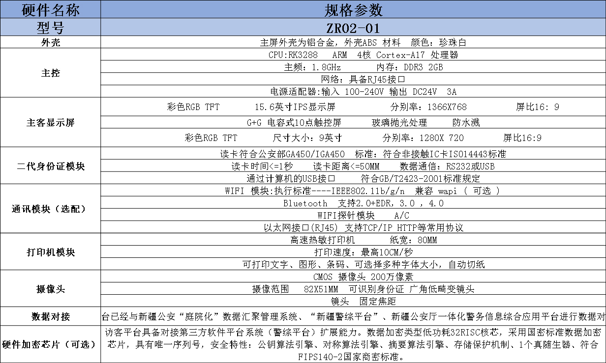 卓睿时代(天津)科技有限公司 卓睿 政府访客一体机 ZR02 高清人脸识别 人证合一比对系统 人证核验系统 自助访客管理系统 单/双屏(可选)10.1英寸 电容式触摸屏 沿用流线外形设计 大气高端 超高配置 性能强悍的访客一体机 能轻松对接各类系统(可轻松做各类门禁,道闸和人证比对系统控制中心,对接各类系统)拥有高亮LED补光灯,人脸比对,身份证识别,热敏打印,指纹模块,高清摄像头,智能感应,云平台管理,高精度扫描模块(可识别二代证)。可实现:访客信息登记,被访人信息登记,现场拍照及人证比对等(如:访客登记和签离,访客数据管理,联动道闸门禁,智能访客预约等)。售前服务:通过全面周到的售前服务帮助客户选择适合产品或解决方案。上门安装:专业的技术工程师为客户提供上门安装服务。人员培训:应客户要求及实际需要派出技术人员对客户进行技术支持和使用培训。售后服务:提供完善的使用手册,维护文件等文字及相关资料,全国联保,提供维修服务。平台已经与新疆公安“庭院化”数据汇聚管理系统,“新疆警综平台”新疆公安厅一体化警务信息综合应用平台进行数据对接.